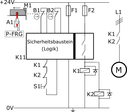 Die Logik wird durch das Sicherheitsschaltgerät K11 und der Abschaltfpad durch K1 und K2 wie zuvor beibehalten.